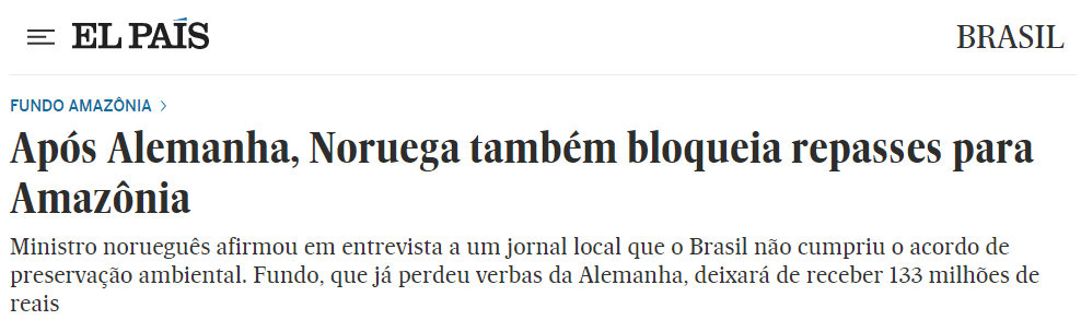 - E assim, a Noruega que era nossa principal doadora, correspondente a 93,8% do dinheiro para ações de preservação ambiental e combate ao desmatamento na Amazônia, também corta o repasse de verbas ao Brasil.