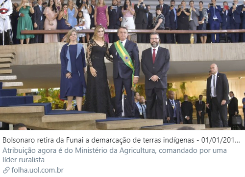 - https://www1.folha.uol.com.br/poder/2019/01/bolsonaro-retira-da-funai-a-demarcacao-de-terras-indigenas.shtml