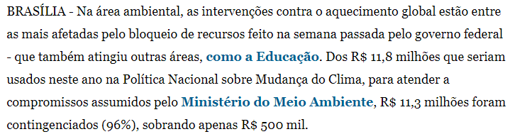 - https://sustentabilidade.estadao.com.br/noticias/geral,ministerio-do-meio-ambiente-quase-zera-verba-de-combate-a-mudanca-climatica,70002818539