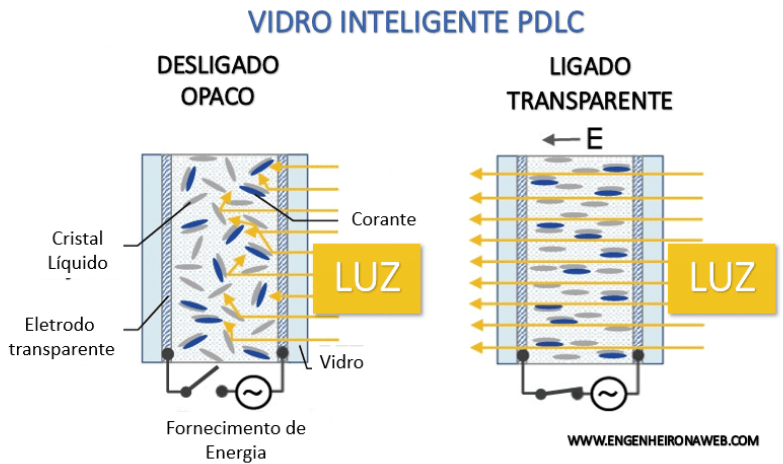 Eles são conhecidos como vidros inteligentes por sua capacidade de oferecer mais benefícios ao usuário além da transparência dos vidros comuns. O smart glass (ou vidro inteligente) é basicamente um vidro ligado à energia elétrica com películas que podem deixar o visual opaco ou transparente, dependendo do momento. Se estiver desligado, ele fica opaco, e pode até ser usado como tela de projeção de imagens. Podem bloquear raios solares e impedir o superaquecimento, diminuindo gastos com energia elétrica ao evitar o uso de ar condicionado. Além disso, também pode ter outras funcionalidades mais avançadas, como funcionar como painel de controle de automação residencial ou como tela para retroprojeção de imagens e vídeos.