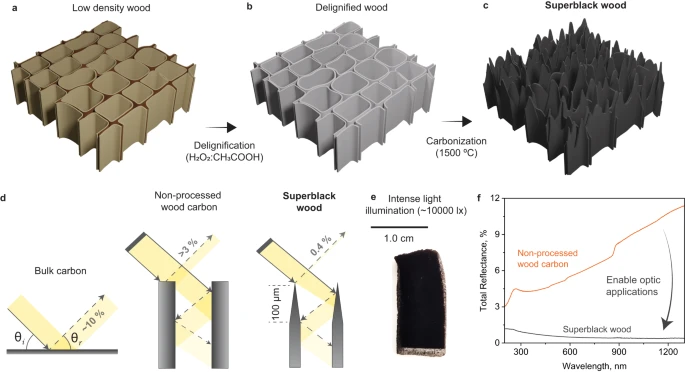A madeira superpreta é resultado de um processo inovador que utiliza gravação por plasma para modificar a superfície da madeira, tornando-a capaz de absorver quase toda a luz que incide sobre ela. Este processo envolve a utilização de plasma para criar uma estrutura nano-porosa na superfície da madeira, que é capaz de capturar e reter a luz, resultando em um material com propriedades de absorção superiores às dos materiais pretos convencionais.